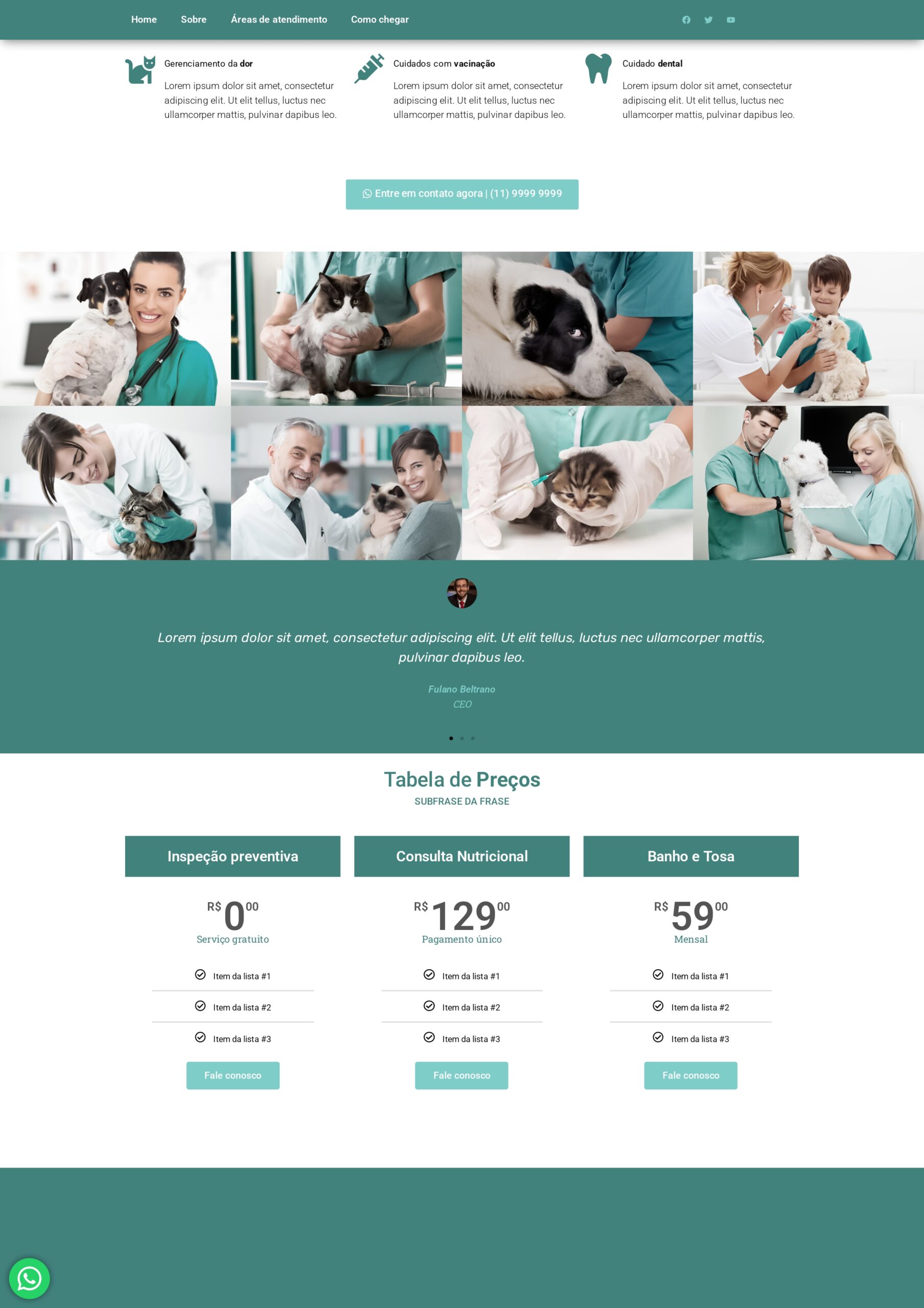 Escolhi a paleta em tons de verde-menta e verde escuro para transmitir calma, cuidado e a ideia de saúde — cores que reforçam confiança e bem-estar no contexto veterinário. O uso do branco cria leveza e deixa o conteúdo mais acolhedor. Os gatilhos aplicados, como números de atendimentos, depoimentos e CTAs suaves, fortalecem credibilidade sem pressão. Toda a estrutura foi pensada para passar segurança, carinho e profissionalismo no atendimento aos pets.